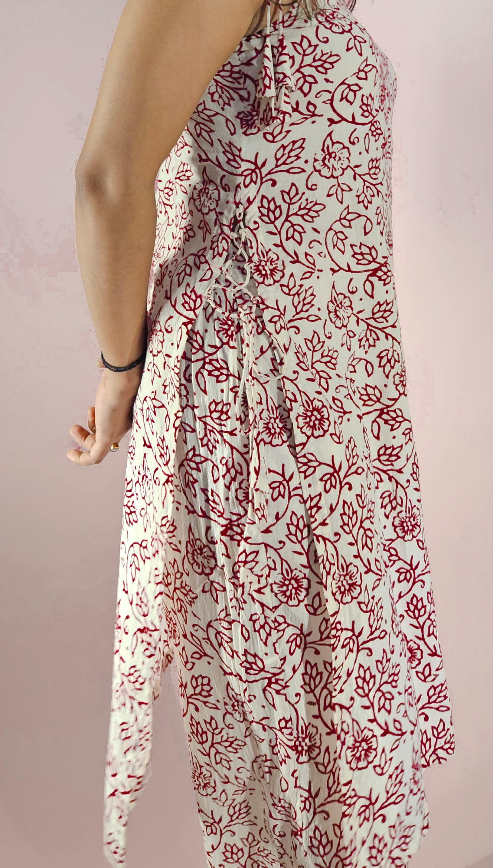 The Kurti features a high side slit, giving it a breezy silhouette and a contemporary edge. With adjustable shoulder straps and delicate drawstrings at the waist, you can tailor the fit to your liking—whether you want it snug and shaped or relaxed and flowy.